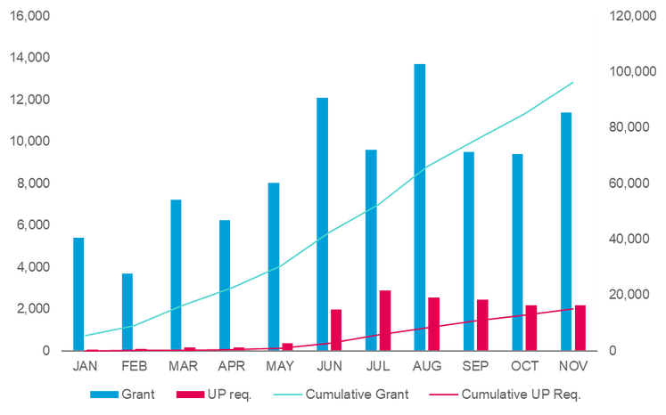 As unitary effect can only be requested after grant of a classical EP, the amount of UP requests can be calculated as a proportion of the total granted EPs, giving an idea on overall uptake of the new system. Taking data from the European Patent Register, Figure 1 shows the number of EPs granted and unitary effect requests received by the EPO for January to November 2023.